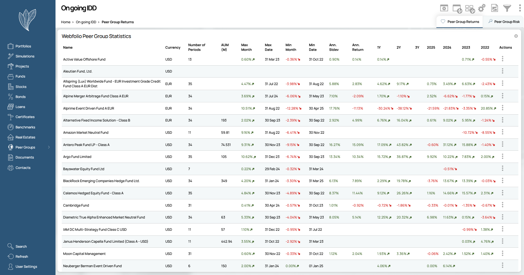 - Access a wide range of financial and risk indicators, such as volatility, Sharpe ratio, drawdown, correlation, and peer group comparisons,
