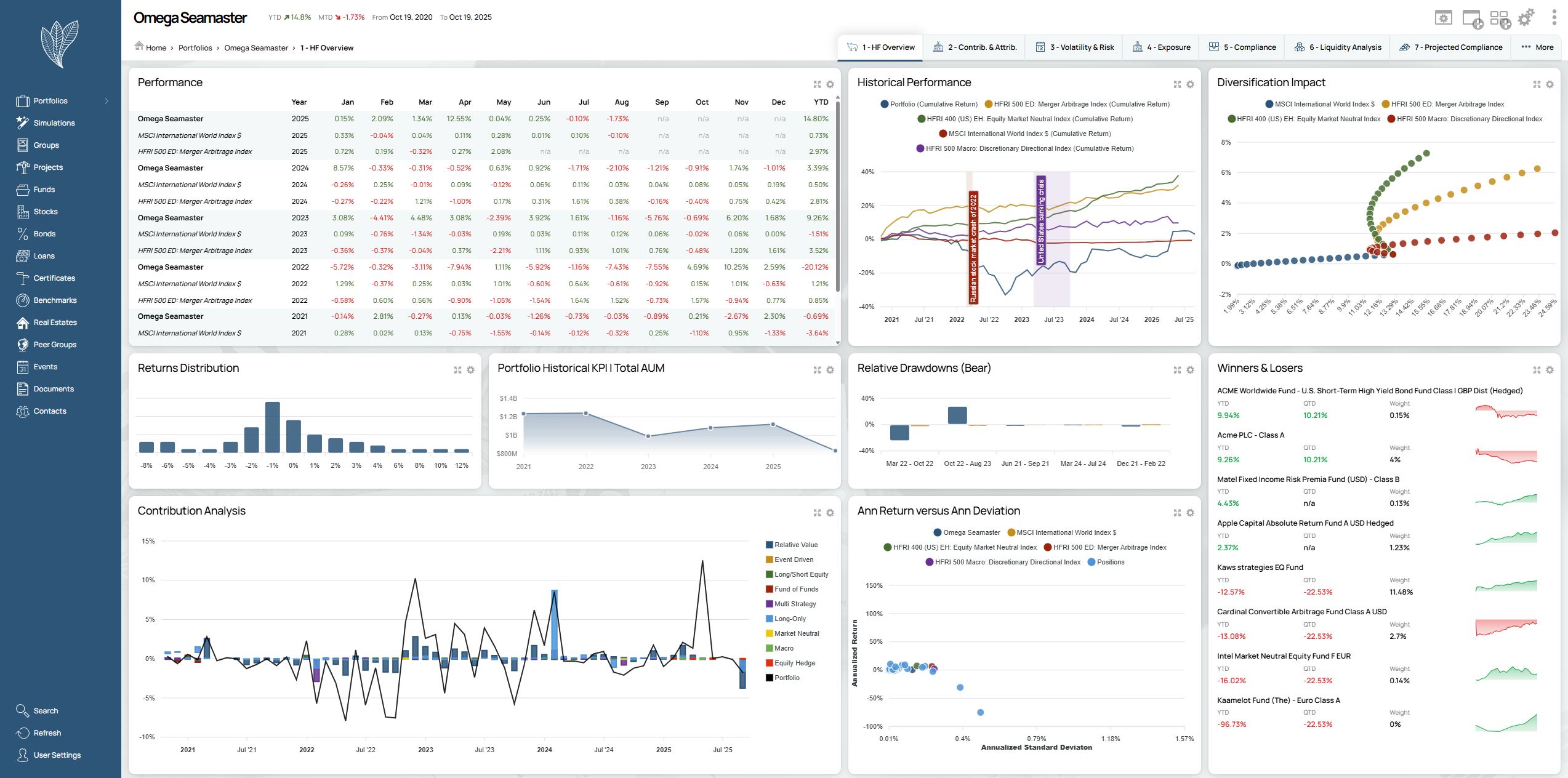 Webfolio equips you with institutional-grade analytics — from detailed allocation breakdowns and peer group comparisons to VaR, contribution to risk, and advanced scenario modeling. Model rebalancing scenarios, forecast exposures, simulate redemptions, and attribute performance with full look-through to underlying positions. Whether you’re evaluating future allocations or auditing past performance, Webfolio’s powerful analysis tools support better investment decisions and regulatory alignment.